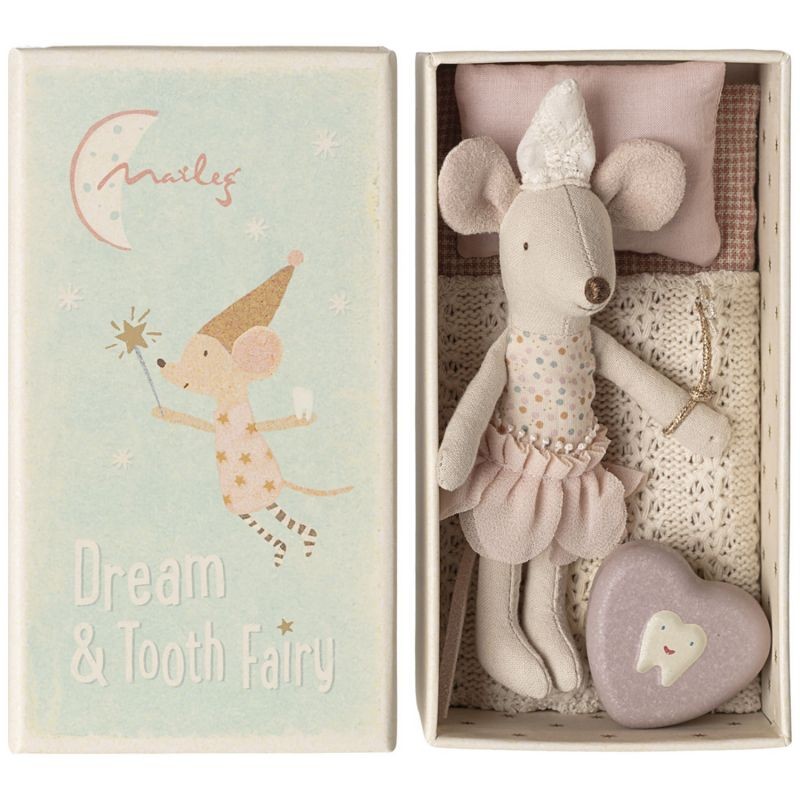 La fée des dents petite sœur de Maileg, dans sa boite avec une boite à dents cœur.