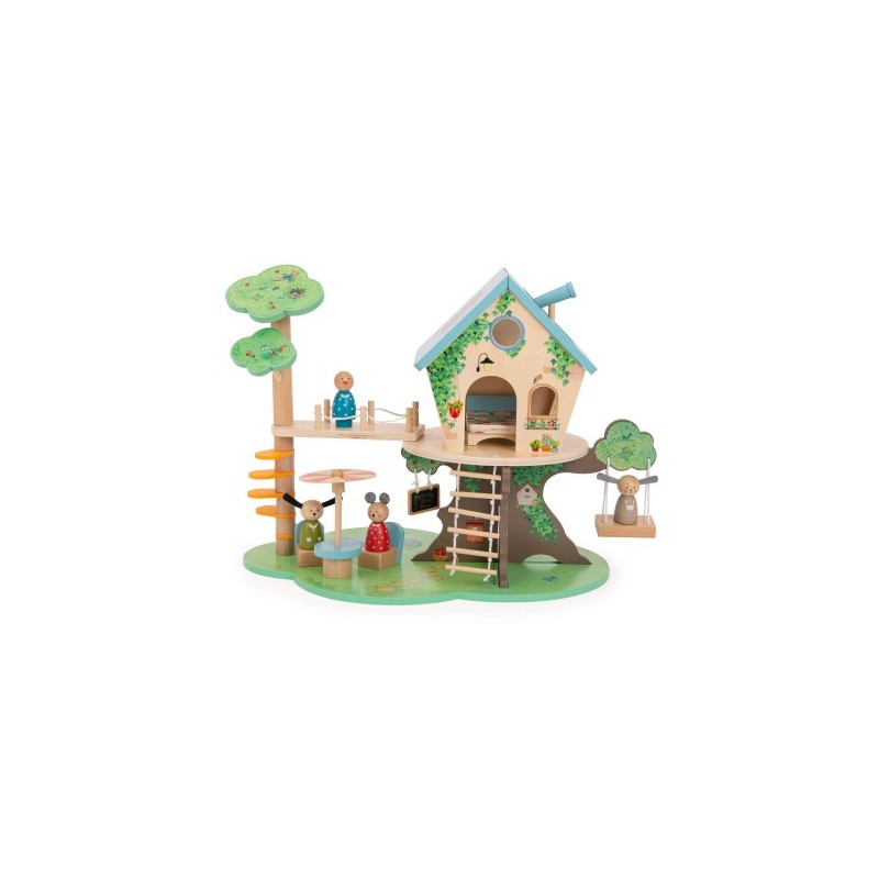 La cabane dans les arbres est l'endroit rêvé pour jouer ! On y accède grâce à l'échelle de corde ou par un pont suspendu à l'arbre voisin. Tout en bois et démontable, elle comprend même un petit salon de jardin pour se reposer à l'ombre… Personnages vendus séparement.