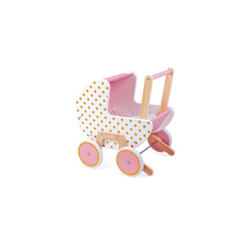 Roues silencieuses en caoutchouc. Pour une sécurité optimale, le landau candy chic est équipé d'un système anti-bascule amovible que vous pourrez retirer lorsque votre enfant se sentira plus à l'aise dans sa démarche. Il est livré avec une jolie couverture ainsi qu'un oreiller à pois dorés pour que doudous et poupées soient confortablement installés. Les axes des roues sont en métal pour plus de solidité et la capote est en tissu. Compatible avec les poupons jusqu'à 42 cm ( poupon non fourni).