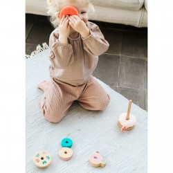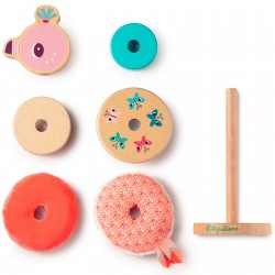 Une pyramide à empiler originale avec différents matériaux, du bois et du tissus. Parfait pour développer la motricité fine des petits bouts.