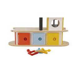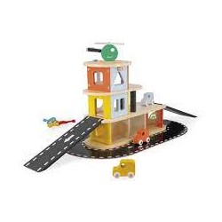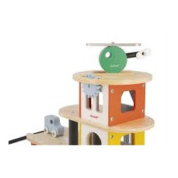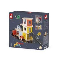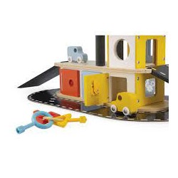 Ce garage est équipé d'un ascenseur mécanique, d'une fonction "boite à clés" au premier étage avec 3 portes à ouvrir avec 3 serrures géométriques différents (rond, triangle et carré) et 3 clés en plastique ainsi que 3 voiture et un hélicoptère en bois pour jouer avec son garage.