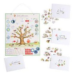 Un grand calendrier comprenant plus de 100 magnets pour se repérer dans le temps et apprendre les saisons, en habillant l'arbre illustré au fil de l'année. Il comprend aussi 4 enveloppes pour ranger chaque saison.