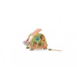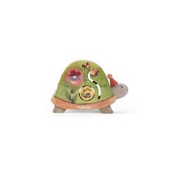 Découvrez la tortue d'activités de la collection Trois petits lapins de Moulin Roty, un jouet en bois offrant de nombreuses activités pour éveiller bébé dès 10 mois.
